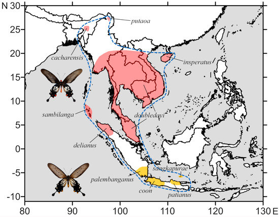 To date, ten subspecies have been placed under L. coon [2,12,13,14], which can be divided into two groups with the following morphological characters and geographic distributions, as shown in Figure 1: (a) four subspecies occupying western and northern Java, southwest Sumatra, and Bawean Island, respectively, ssp. palembanganus (Rothschild, 1895), ssp. coon, ssp. patianus (Fruhstorfer, 1898), and ssp. sangkapurae (Bollino and Sala, 1992), possessing yellow marginal spots on the hindwing (referred to as yellow marked coon) with the hindwing discal cell patch reaching the base of the cell; (b) six subspecies found from northeastern India, northern Myanmar, Nicobar Islands, Indochina and Malay Peninsula, Hainan Island, and northern Sumatra, namely ssp. cacharensis (Butler, 1885), ssp. putaoa (Tytler, 1939), ssp. sambilanga (Doherty, 1886), ssp. doubledayi (Wallace, 1865), ssp. insperatus (Joicey and Talbot, 1921), and ssp. delianus (Fruhstorfer, 1895), which all share red marginal spots on the hindwing (referred to as red marked coon), and the hindwing discal cell patch does not reach the base of the cell.