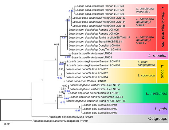 The Bayesian phylogenetic tree of genus Losaria (Moore, 1902) with Pharmacophagus antenor and Pachliopta polyphontes as outgroups. The branch tip labels of taxon names follow the current taxonomy, while the names in red colour blocks reflect changes proposed in this study. Black values at nodes indicate the posterior probability, and the blue values indicate the probabilities for Losaria taxa identified by the Bayesian–Poisson tree process model (bPTP).
