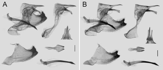 Comparison of male genitalia of Losaria coon (A) and L. doubledayi (B); scale bars = 1.0 mm.