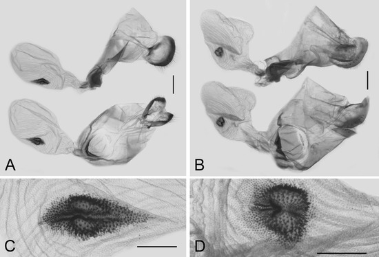 Comparison of female genitalia of Losaria coon coon (A) and L. doubledayi (B), scale bars = 1.0 mm; with enlarged signum (C) and (D), scale bars = 0.5 mm.