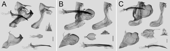 Male genitalia of Losaria rhodifer (A), L. neptunus (B), and L. palu (C); scale bars = 1.0 mm.