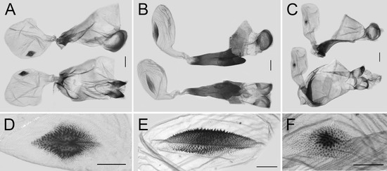 Among the male and female genitalia of the other three species of Losaria, those of L. rhodifer are similar to the previously mentioned two species, but the shape of valve tip of the male genitalia and the ostium, lamella antevaginalis, and signum are still different, as shown in Figure 7A and Figure 8A,D. Such resemblance indicates that L. rhodifer is closely related to both L. coon and L. doubledayi, as previously mentioned. The genitalia of both sexes of L. neptunus and L. palu are all significantly different, as shown in Figure 7B,C and Figure 8B–F, supporting the phylogenetic relationships with L. coon and L. rhodifer, as inferred by the molecular data.