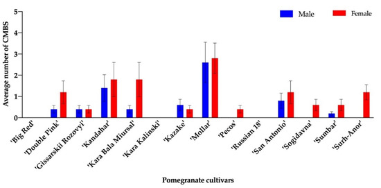 The geographical origin of the pomegranate cultivars might play a role in determining the susceptibility of host plants to CMBS. According to online database [54,62], the 35 tested pomegranate cultivars in 2016 and 2019 have origins in either Georgia, India, Iran, the Soviet Union or Russia, the United States, or Turkmenistan. No tested cultivar was known to be from China, which suggests that the reported heavy CMBS infestations on pomegranates may be confined to certain pomegranate species or cultivars developed in China.
