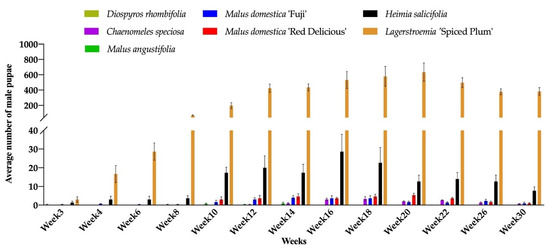 The highest mean number of male pupae and gravid females on L. ‘Spiced Plum’ was 634.3 ± 206.4 (mean ± SE) male pupae at week 20 and 167.0 ± 52.5 (mean ± SE) gravid females at week 18, respectively. Both male pupae and gravid females were observed on C. speciosa, H. salicifolia, M. domestica ‘Fuji’, and M. domestica ‘Red Delicious’, with lower levels of infestation compared to Lagerstroemia. In addition to L. ‘Spiced Plum’, the highest mean number of male pupae recorded during the experiment was 3.3 ± 2.0 (mean ± SE) on C. speciosa, 28.7 ± 15.9 (mean ± SE) on H. salicifolia, 4 ± 2.1 (mean ± SE) on M. domestica ‘Fuji’, and 5.3 ± 1.9 (mean ± SE) on M. domestica ‘Red Delicious’, respectively. The highest mean number of gravid females recorded during experiment was 3.3 ± 0.9 (mean ± SE) on C. speciosa, 10.0 ± 6.4 (mean ± SE) on H. salicifolia, 3.7 ± 2.7 (mean ± SE) on M. domestica ‘Fuji’, and 1.3 ± 0.3 (mean ± SE) on M. domestica ‘Red Delicious’, respectively. Only a few male pupae were observed on D. rhombifolia (0.3 at week 3) and M. angustifolia (1 at week 14) (Figure 2). The effect of host plant in altering insect sex differentiation was observed in this study, as the male to female ratios on C. speciosa, H. salicifolia, L. ‘Spiced Plum’, M. domestica ‘Fuji’, and M. domestica ‘Red Delicious’ was 0.81:1, 2.25:1, 3.67:1, 0.99:1, and 7.23:1 respectively, throughout the experiment.