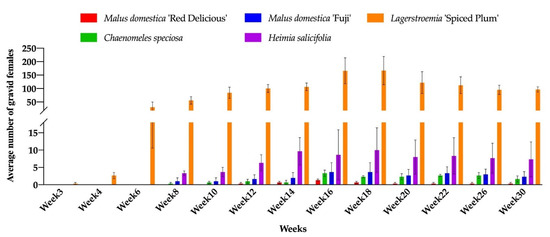 No male pupae and gravid females were observed on B. harlandii, B. microphylla var. koreana × B. sempervirens, D. virginiana, Rubus ‘Arapaho’, R. fruticosus, R. idaeus ‘Dorman Red’, and R. ‘Navaho’, The male pupae were first observed on D. rhombifolia, H. salicifolia, L. ‘Spiced Plum’, and M. domestica ‘Fuji’ in week 3. The gravid females were first observed on L. ‘Spiced Plum’ in week 3. The delayed onset of infestation was observed for C. speciosa, H. salicifolia, M. domestica ‘Fuji’, and M. domestica ‘Red Delicious’. The first detection of gravid females on C. speciosa, H. salicifolia, and M. domestica ‘Fuji’ was 8 weeks after inoculation (WAI), and 12 WAI on M. domestica ‘Red Delicious’, compared to 3 WAI of the first detection on L. ‘Spiced Plum’ (Figure 3). The different onset of infestation could be due to the varied development durations of nymphal stages, which shows the different level of adaptive behavior of CMBS towards novel hosts.