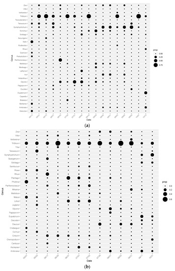 Proportional abundance of pollen samples using pollen metabarcoding analysis. Circle size indicates proportional abundance of a given taxa on a given sampling date. (a) In 2016, key genera detected were Trifolium (clovers), Symphyotrichum (American asters), and Glycine (soybeans). (b) In 2017, Trifolium was a key genus detected; however, a diverse array of additional taxa were detected in moderate abundances.