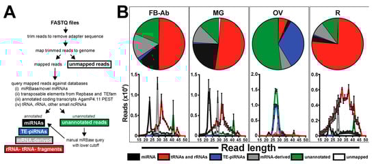 Diversity of small ncRNA groups across mosquito tissues. (A) Flow chart for the small ncRNA query against various databases. (B) Female mosquito tissues analyzed were (i) fat body-abdominal wall (FB-Ab), (ii) midgut (MG), (iii) ovary (OV), and (iv) the remaining tissues comprised of the head and thorax (R). Annotated small ncRNA groups include (i) miRNAs, (ii) tRNA/rRNA, (iii) TE-piRNAs, (iv) mRNA-derived small ncRNAs, (v) unannotated, and (vi) unmapped. For each mosquito tissue group, data demonstrate the read annotation percentages and the corresponding histograms of the nt size representing the various small ncRNA groups. All values graphed as average +/− SEM from three biological replicates.