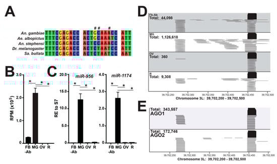 miR-956 expression dynamics across mosquito tissues. (A) miR-956 sequence alignment across dipterans; ‘#’ indicates a nucleotide mismatch between the A. gambiae and D. melanogaster miR-956 sequences. (B) Expression of miR-956 is significantly higher in the midgut (MG) over the fat body abdominal wall (FB-Ab), ovary (OV), and remaining head and thorax tissues (R). Reads per million (RPM) values are graphed as the average +/− SEM from three biological replicates; ‘*’ indicates statistical significance by one-way analysis of variance (ANOVA) followed by Tukey’s multiple comparisons test, p < 0.0001. (C) The validation of the miR-956 enrichment in midgut tissues by RT-qPCR, values graphed as the average +/− SEM from three biological replicates; ‘*’ indicates statistical significance by one-way ANOVA followed by Tukey’s multiple comparisons test, p < 0.0001. miR-1174 served as the positive control for midgut miRNA enrichment. (D) Mapping of miR-956 reads to 39.7 Mb loci on chromosome 3L across mosquito tissues. (E) AGO1 and AGO2 loaded miR-956 reads mapping to 39.7 Mb loci on chromosome 3L, using reanalyzed sequencing data obtained from [15].