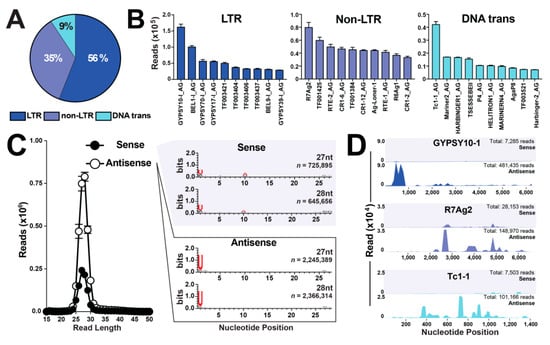 Following miRNA, tRNA, and rRNA depletion, the remaining reads were queried against transposable elements (long terminal repeats (LTR), non-LTR, and DNA transposons) retrieved from Repbase (girinst.org) and tefam (tefam.biochem.vt.edu, courtesy of Jake Tu at Virginia Tech University), allowing for 2 nt mismatches. Sequence strand orientation was determined using the CLC Genomics Workbench version 12.0. Sequence signature bias was determined using WebLogo 3 (weblogo.threeplusone.com).