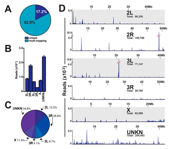 A majority of piRNA sequences map to multiple chromosomal locations in a variety of organism genomes [4,5,6,7,31]. To this end, 82.8% of piRNAs from our mosquito ovary small RNA libraries were found to be multi-mapping, and 17.2% of piRNA were determined to be unique mapping (Figure 4A). For the unique mapping piRNAs, we determined: (i) read intensity across chromosomes with a range of 28,262–241,335 reads for chromosome 3R and chromosome UNKN, respectively (Figure 4B); (ii) chromosomal contribution with a range of 4.1–34.8% for chromosome 3R and chromosome UNKN, respectively (Figure 4C); and (iii) a genomic loci map of unique mapping piRNAs (Figure 4D). The number of unique mapping piRNAs varied across the mosquito genome with two notable piRNA clusters that accounted for ~20% of all unique mapping piRNAs. Indeed, the 58 Mb loci on chromosome 2R and the 21 Mb loci on chromosome 3L accounted for 17.7% and 3.3% of unique mapping piRNAs, respectively (Figure 4D).