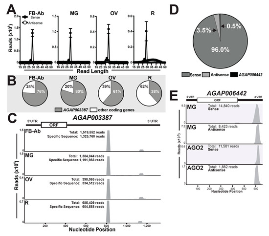 From our mRNA-derived small ncRNA list (Dataset S5), reads ranged in nucleotide size from 15 nts (from AGAP002104) to 37 nts (from AGAP001546) (Dataset S5). Reads mapped to mRNA transcripts in (i) sense, (ii) antisense, or (iii) sense and antisense orientations (Dataset S5). At ~96%, a majority of mRNA-derived small ncRNAs were mapped in sense orientation across all tissues (Figure 5A,D, and Dataset S5). Further, 60% (8,827,997 reads in total across all mosquito tissue small RNA libraries) were mapped to 3′UTRs of their target mRNA (Dataset S5). Of note, AGAP006442 was the only candidate gene with both sense and antisense orientation reads mapping to the 3′UTR (Figure 5D) and was only present in midgut libraries (Figure 5E and Figure S3, and Dataset S5). In agreement with previous reports on An. gambiae [24,25,26], the gene AGAP003387 accounted for the highest amount of mRNA-derived small ncRNAs (Dataset S5) with a range of 38–80% for remainder tissue and midgut tissue, respectively (Figure 5B). The most impressive data point is the 3′UTR mapping 29 nt sequence, 5′ UUCGGAUGUAACAUCUAGUAUAAAACCU 3′, which on average of all the total reads from all small RNA libraries accounted for (i) ~10.52% (~1,228,435 reads) in the fat body-Ab, (ii) ~7.93% (~924,497 reads) in the midgut, (iii) ~3.45% (~410,795 reads) in the ovary, and (iv) ~3.12% (~369,519 reads) in the remainder tissue, (Figure 5C, Dataset S5, and Table S1). Reads mapping both sense and anti-sense to AGAP006442 resembled siRNAs, which is in agreement with [25]. Thus, to gain evidence for physiological relevance, we questioned if mRNA-derived small ncRNAs to AGAP006442 were loaded into AGO2 by interrogating publicly available sequence data [15], as loading into AGO proteins is highly suggestive of functionality. Here, we found AGAP006442 to have the highest number of mapped reads (9.4% of mRNA-derived ncRNAs) with 11,501 and 1882 reads mapping in sense and anti-sense orientation, respectively (Figure 5E). Additionally, AGAP006442-derived small ncRNAs from (i) AGO2- and (ii) our midgut- small RNA libraries exhibited similar 3′UTR mapping properties (Figure 5E).
