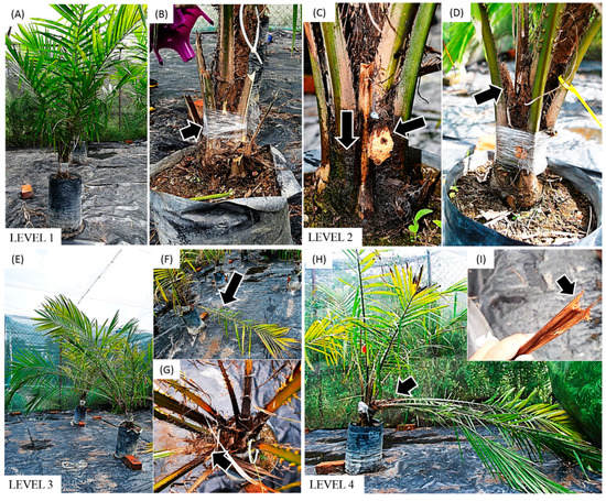 Visual symptom level of RPW infestation in oil palm plantlings based on empirical observations in this greenhouse experiment. (A,B) Level 1 infestation observed between first to the third week: no symptoms visible especially at the sealed crown base. (C,D) Level 2 infestation observed between fourth to sixth week: dark oozes and smelly sap together with soft, creamy-coloured tissue appeared at the crown base; brown sawdust recorded between the plantling’s trunk and the base of the leaves. (E–G) Level 3 infestation observed between sixth to ninth week: host plant’s shoot started to lean to the ground; the leaves started to fall; loss of symmetry at palm upper crown. (H,I) Level 4 infestation observed at the ninth week: leaves collapsed and started to show skirting shape; shoot was dried out and fell off.