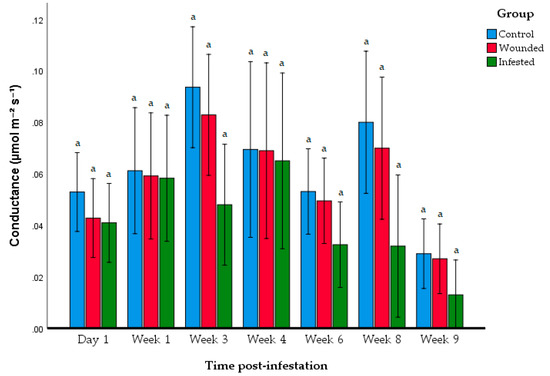 Stomatal conductance of each group at at different periods after infestation. Data shown as mean + S.D. Different letters indicate significant differences among the control, wounded, and infested group within each time post-infestation period based on ANOVA following the Tukey multiple comparison test (p > 0.05).