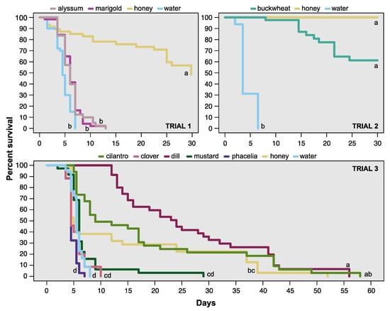 Survival curves of female Trissolcus japonicus fed with flower treatments, honey, or water inside vials in the lab. Per results of log-rank analysis and post-hoc tests, lines with different letters are significantly different from each other.