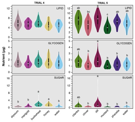 Kernel density plots of nutrient levels of female Trissolcus japonicus fed with flower treatments, honey, or water for 48 h inside vials in the lab. Internal boxplots show the median, interquartile range, maximum, and minimum. Treatments with different letters are significantly different based on Tukey post-hoc tests.
