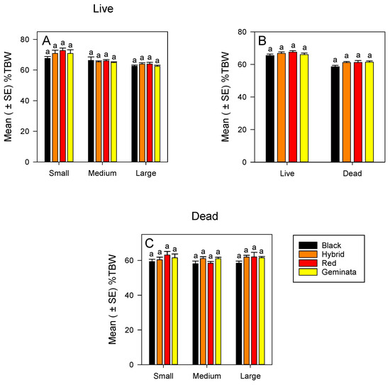 Mean (± SE) percentage of total body water (%TBW) for: (A) Live S. richteri (Black), S. invicta × S. richteri (Hybrid), S. invicta (Red), and S. geminata (Geminata) fire ants compared within each worker size class; (B) Combined worker size classes of S. richteri, S. invicta × S. richteri, S. invicta, and S. geminata fire ants compared within each live/dead status; and (C) Dead S. richteri, S. invicta × S. richteri, S. invicta, and S. geminata fire ants compared within each worker size class. Means with the same letter within each worker size class or species are not significantly different (p < 0.05). n = 14 or 15 individuals per worker size class per species.