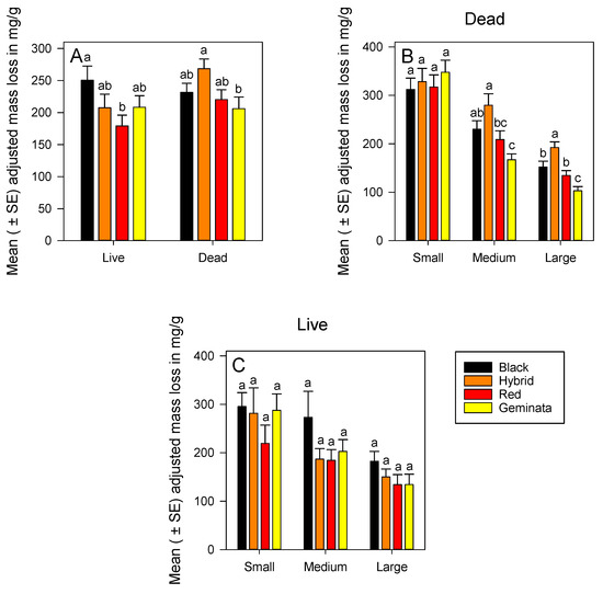 Mean (± SE) adjusted mass loss for: (A) Combined worker size classes of S. richteri (Black), S. invicta × S. richteri (Hybrid), S. invicta (Red), and S. geminata (Geminata) fire ants compared within each live/dead status; (B) Dead S. richteri, S. invicta × S. richteri, S. invicta, and S. geminata fire ants compared within each worker size class; and (C) Live S. richteri, S. invicta × S. richteri, S. invicta, and S. geminata fire ants compared within each worker size class. Means with the same letter within each worker size class or species are not significantly different (p < 0.05). n = 14 or 15 individuals per worker size class per species.