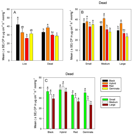 Mean (± SE) calculated cuticular permeability (CP) for: (A) Combined worker size classes of S. richteri (Black), S. invicta × S. richteri (Hybrid), S. invicta (Red), and S. geminata (Geminata) fire ants compared within each live/dead status; (B) Dead S. richteri, S. invicta × S. richteri, S. invicta, and S. geminata fire ants compared within each worker size class; and (C) Dead small, medium, and large ant worker size classes compared within each Solenopsis species.