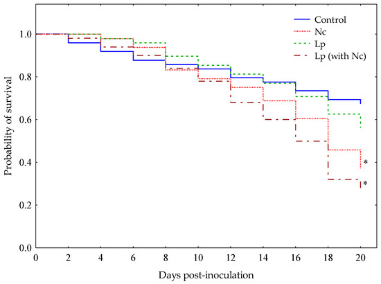 Kaplan-Meier survival curves distribution of worker bees in each experimental group during the 20 days. Each curve represents bees naturally infected with Lotmaria passim (Lp), healthy bees inoculated with N. ceranae (Nc), bees naturally infected with L. passim and inoculated with N. ceranae (Lp (with Nc) = mixed-species infection) and uninfected honey bees (control). Asterisks indicate significant differences (* = p < 0.05) of pathogen-infected bees with respect to the control group, according to the Log-rank test with Holm-Bonferroni correction.