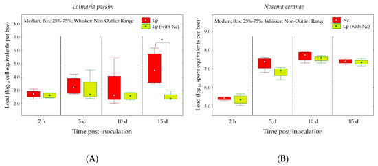Lotmaria passim (A) and N. ceranae (B) loads quantified in bees naturally infected with L. passim (Lp) and bees that were L. passim-infected and inoculated with N. ceranae (Lp (with Nc)) at different times post-inoculation. Asterisks in the box plots indicate significant differences (* = p < 0.05) of pathogen loads according to the Mann-Whitney U test.