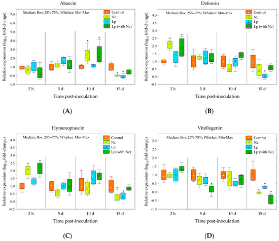 Box plot graphics showing the expressions (relative expressions) of genes encoding the antimicrobial peptides abaecin (A), defensin (B), hymenoptaecin (C) and vitellogenin (Vg) (D) in bees naturally infected with L. passim (Lp), healthy bees inoculated with N. ceranae (Nc), bees that were L. passim-infected and inoculated with N. ceranae (Lp (with Nc)) and uninfected honey bees (control). Asterisks in the box plot indicate significant differences (* = p < 0.05) with respect to the control group, according to the post hoc Dunnett test for each time post-inoculation (2 h, as well as 5, 10 and 15 days).