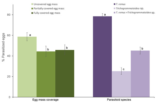 Egg parasitism of Spodoptera frugiperda (% ± SE) by T. remus, Trichogrammatoidea sp.; and combined T. remus + Trichogrammatoidea sp. of fully covered, partially covered, and uncovered egg masses. Bars bearing different letters within column groups were significantly different (Bonferroni test, α = 0.05).