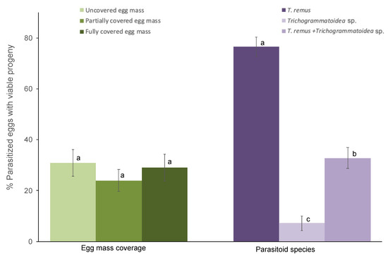 Viable progeny emerging from eggs of Spodoptera frugiperda (% ± SE) parasitized by T. remus, Trichogrammatoidea sp., and combined T. remus + Trichogrammatoidea sp. of fully covered, partially covered, and uncovered egg masses. Bars bearing different letters within column groups were significantly different (Bonferroni test, α = 0.05).