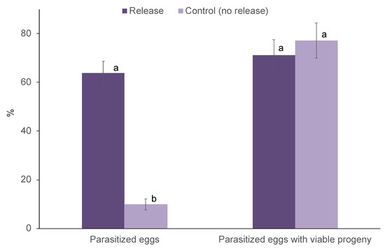 The overall parasitism for both trials was significantly higher in released fields than control fields (F1,12 = 93.99; p < 0.001; Figure 3). However, a significant difference was not found for years (F1,12 = 1.59; p = 0.23). Likewise, the years and treatments interaction does not affect the parasitism (F1,12 = 0.29; p = 0.60).