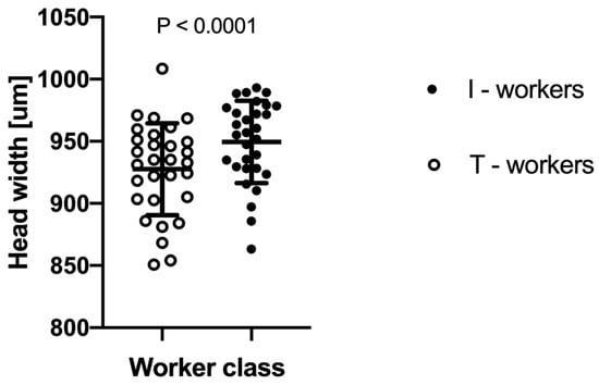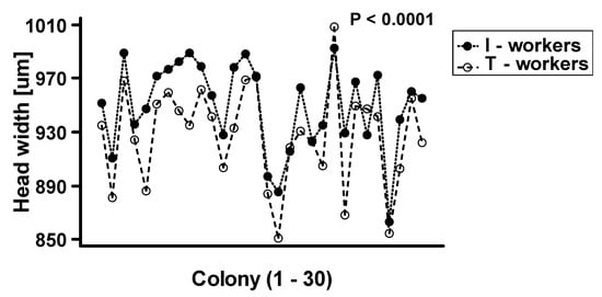 The body size of each ant was measured, determined as the maximum head width above the eyes (“HW” according to Czechowski et al. [25]). Head width is a commonly used estimator of the body size of ants, including Lasius ants [29,30,31,32]. The measurements were performed under 100 magnification using a Met-153 metallographic microscope connected to a digital camera. Head widths were measured to the nearest 0.00001 mm based on digital photos using the Panasis v2.4.2 Huvitz program. All measurements were made by one person (MO). Each sample of intranidal workers (I-workers) numbered 50 individuals, while the samples of bait-attending workers (T-workers) ranged between 32 and 50 individuals. A total of 2905 measurements were made. In order to check the accuracy of the measurements, 25 ants were measured twice. The results of the first and the second set of measurements were correlated using simple regression. The high correlation coefficient (r = 0.99, p < 0.0001) indicates a satisfactory repeatability of the measurements.