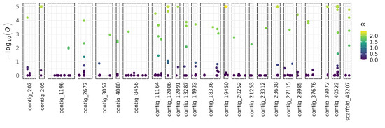 Although we did not detect variation associated with presence of a parasitoid, parasitism rates vary across sites in NZ [18]. Regional genetic differences could be related to selection acting on different loci North and South of the Main Divide and/or genetic drift acting on isolated populations. To investigate the genetic differentiation between regions, we grouped individuals that were collected from North and South of the Main Divide (Figure 1). The two groups had a mean FST of 0.013. We detected 47 SNPs with skewed allele frequencies across 24 contigs in the draft genome with BayeScan (Figure 2). The contigs containing these SNPs had a total of 3–36 SNPs, and all 47 of the detected SNPs had positive α values, suggesting diversifying selection (Supplementary Materials Table S2). The SNPs identified by BayeScan were an average of 11.5 kb from the nearest genes. None of the closest genes were homologous to genes with characterized functions in insects. Using an additional method, 3 SNPs on another contig had outlying cross-population extended haplotype homozygosity (XPEHH) scores (Supplementary Materials Table S2; [51,52]). No common regions were identified by both methods.