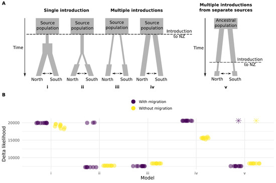Models used to simulate site frequency spectra (SFS) for comparison against the observed SFS. (A) Models i and ii represent introduction via a single route. In model i the population contracts on introduction and then begins expanding before dispersal. In model ii, dispersal occurs while the effective population size remains small. Models iii and iv represent multiple routes of entry, with or without reduction in population size compared to the current populations in New Zealand. Model v represents introduction to different sites from source populations that were isolated prior to introduction. All models were tested with and without migration between Northern and Southern populations. (B) Likelihood estimations from ten runs of each model. We used 1M simulations and 60 optimisation cycles per run [46]. Runs that ended with a non-finite delta likehood after 1M simulations are shown as an asterisk. The models that include a bottleneck after separation of the two populations had the lowest delta likelihoods, and model iii (with migration) had the lowest mean delta likelihood across runs.