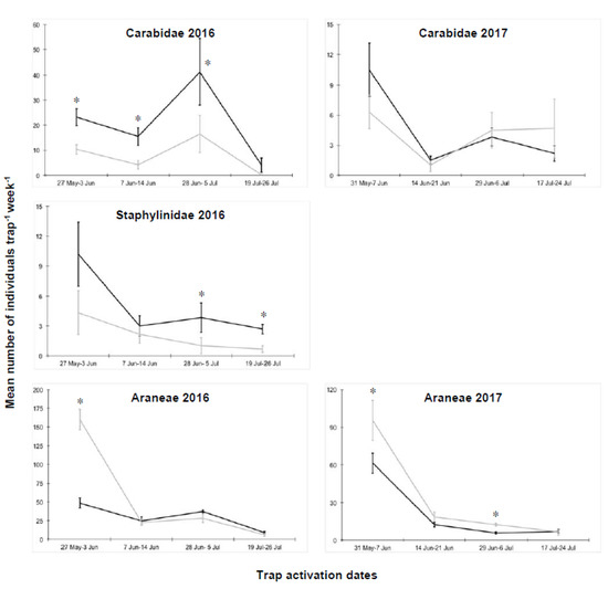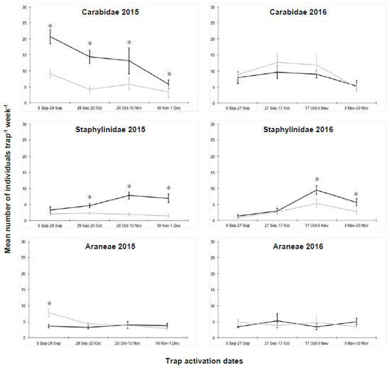 Abundance of individual Carabidae, Staphylinidae and Araneae collected in the experimental plots of cauliflower, where the cover crops were terminated either with a roller crimper (IL-RC, black line) or through green manuring (GM, grey line). Vertical bars represent standard errors of the means; * = significant differences within each sampling date as detected by the generalized linear mixed model.