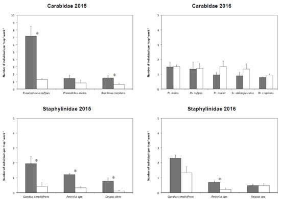 Mean number of individuals caught per trap per week of the dominant species of Carabidae and Staphylinidae collected in the experimental plots of cauliflower, where the cover crops were terminated either with a roller crimper (IL-RC, dark grey bars) or through green manuring (GM, white bars). Lines represent the standard errors of the means; * = significant differences for each species as detected by ANOVA.