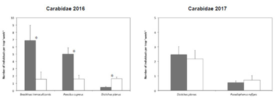 The cover crop residues left on the soil, together with a reduced tillage system, can affect the assemblages of ground-dwelling arthropods by providing shelter, favorable microclimatic conditions, and food resources, and by lowering disturbance [18]. Species that thrive in closed habitats, with high amounts of plant residues, and that can exploit the decomposer community for prey, are likely to be favored [19]. Increased abundance and diversity of ground-dwelling arthropods could promote biological control of pest insects that is especially valuable for organic growers [20]. For example, Magagnoli et al. [21] demonstrated that the method of cover crop termination may influence the predation rate of artificial caterpillars by ground beetles (Coleoptera Carabidae).