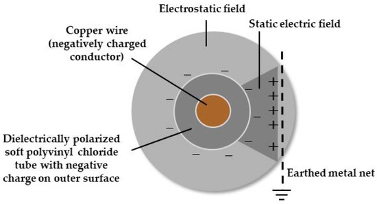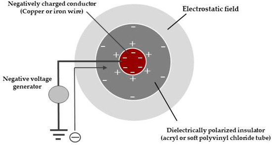 Electric field is defined as the space surrounding an electric charge, within which it is capable of exerting a perceptible force on another electric charge [6]. The electric field can be generated in the space surrounding the insulated conducting wire (metals such as copper and iron); the wire is electrified by connecting a negative voltage generator that is earthed (Figure 1).