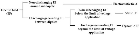 Figure 2 shows various electric field configurations. An electrostatic field is formed in the surrounding space of a charged, insulated conductor used as a single pole. In this field, the electricity that accumulates on the charged conductor is not released (namely, not discharged) in the field. In contrast, the electric field formed between oppositely charged poles may result in an electrical discharge if the applied voltage exceeds a certain limit, regardless of whether the conductor is insulated or not. This type of electric field is distinguished by the presence or absence of a discharge. Hereafter, the non-discharging electric field is referred to as a static electric field, and the discharge-generating electric field as a dynamic electric field (or merely, electric field).