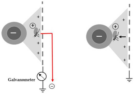 The theme of this section is the insect itself and how it responds to the static electric field upon entering. Most insects possess a solid cuticle layer, which is the outer protective layer that covers the body of many invertebrates. This layer is known to be conductive; thus, an insect that enters the static electric field is deprived of its free electrons in the cuticle layer and becomes positively charged. This implies that discharge-mediated positive electrification can be induced in the actual insect, as the free electrons of the cuticle layer move to earth ground. A galvanometer (a kind of ammeter used for detecting electric current) can be integrated into the ground circuit to detect this type of electron movement. Positively electrified insects are attracted to the central insulated conductor wire (Figure 4). This force is so strong that the captured insect cannot escape from this trap [11,12]. This capturing mechanism is applicable to almost all insects, as they tend to possess a conductive cuticle layer.