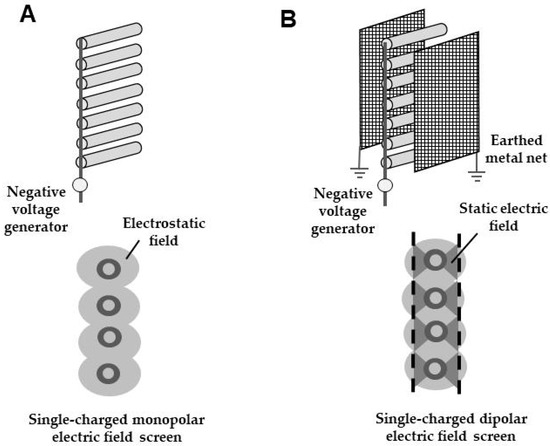 As shown in Figure 3, the static electric field is formed inside the electrostatic field. If we place another earthed net on the opposite side of the insulated conductor wire, the static electric field forms in a manner consistent with bilateral symmetry. Accordingly, if we arrange the insulated conductor wires such that the upper and lower ends of the two static electric fields contact each other, a new electrostatic barrier of static electric fields is constructed. A single-charged monopolar electric field screen is constructed by insulating conductor wires with a soft polyvinyl chloride tube, arranging them in parallel at constant intervals and linking them to each other and to a voltage generator (Figure 5A) [3]. A single-charged dipolar electric field screen is formed simply by placing an earthed metal net inside the electrostatic field that was produced by a single-charged monopolar screen (Figure 5B). However, there is a remarkable difference in their insect-capturing capabilities.