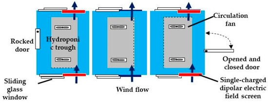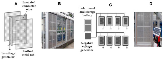 The purpose of the present study was to introduce the potential abilities of high voltage electric fields to workers in the pest control research field. The most notable phenomenon regarding electric fields was the strong attractive force generated in non-discharging electric fields such as electrostatic and static electric fields. This attractive force formed the basis of the electric field screen function. The electric field screen was constructed as an air-shielding apparatus devised by harnessing the nature of the electric field. This apparatus was used to prevent airborne spores of pathogens, flying insect pests, pollen grains that cause pollenosis, and fine smoke particles from entering the inside of various facilities. The electric field screen is applicable to facilities such as domestic housing, hospitals and school buildings, greenhouses for crop production, warehouses and processing plants for post-harvest crops, and animal husbandry facilities. A wide variety of electric field screen structures can be customized to prevent the entry of biotic and abiotic environmental nuisances. All screens have a simple, common structure; therefore, the cost of production is relatively low. A single-charged, dipolar type of electric field screen is now commercially available because the conductors, which are the crucial components of the electric field screen, are coated with polyvinyl chloride resin to prolong screen operation in outdoor environments with minimal deterioration. This type of electric field screen is built and sold by a joint-stock company (Sonoda Seisakusho Co. Ltd., Osaka, Japan), which undertakes the design, installation, inspection, and maintenance of the electric field screens. Another application of attractive force was in the production of an electrostatic insect sweeper [23], which is useful for directly trapping insect pests such as whiteflies and aphids that frequently rest on leaf surfaces, and an electrostatic flying insect catcher (electrostatic racket) [24], which is an apparatus that is used to capture flying pests directly. Such equipment is carried by greenhouse attendants during ordinary plant care checks.