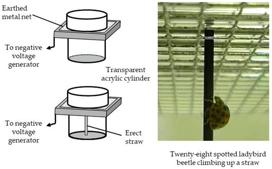 - Matsuda, Y.; Takikawa, Y.; Kakutani, K.; Nonomura, T.; Toyoda, H. Analysis of Pole-Ascending–Descending Action by Insects Subjected to High Voltage Electric Fields. Insects 2020, 11, 187. [Google Scholar] [CrossRef] [PubMed]