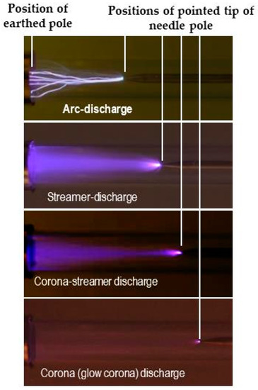 The state of the corona depends on the polarity of the needle pole (a distinction between positive- and negative-charging), the potential difference between poles, and the pole distance. In the case that the needle pole is positively charged, a corona discharge (positive corona discharge) can change from a glow discharge (corona discharge surrounding the tip portion) to a streamer discharge via a brush-like discharge by increasing the applied voltage and/or decreasing the distance between the poles. The discharge finally breaks down with an arc discharge between the two poles (Figure 9) [19]. If the needle pole is negatively charged, the corona is induced at lower voltages than the positive needle pole. Although glow corona with a short streamer discharge is generated, it does not become larger and is followed by a complete breakdown in the form of an arc discharge [20].