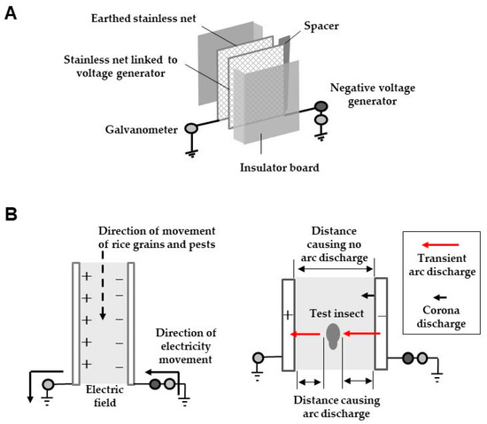 The arc discharge-generating screen consists of two stainless steel nets [21]. One net is linked to a negative voltage generator and the other to a grounded line. The insulator board is attached to the outer surfaces of stainless steel nets to prevent grain (mainly rice grain) from falling through the net (Figure 10A). This screen is used to irradiate pests nesting in the grains directly (such as rice weevil, red flour beetle, Azuki bean weevil, and cigarette beetle) [22], with a transient arc discharge. This way, only the pests are dismembered. The screen structure is simple, but exhibits excellent functionality.