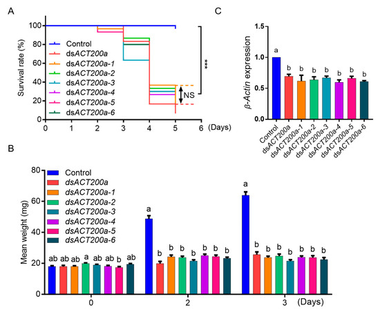 RNAi effects on Colorado potato beetle (CPB) larvae fed with different in vitro synthesized dsRNA variants. (A) Kaplan-Meier survival curves of third-instar CPB larvae fed with potato leaves that had been painted with identical amounts (4 ng/cm2) of indicated dsACTs. The log-rank test was used to assess the significance of differences between two survival curves. *** p < 0.001; NS, not significant. (B) Mean weight of surviving CPB larvae at the indicated days of feeding. Data are means ± SE (n = 30). (C) Relative expression levels of β-Actin in the CPB larvae in (A) at day 3. Gene expression levels were set as one in CPB larvae fed with H2O-painted control leaves. Data are means ± SE (n = 3). The letters above each bar in (B,C) indicate the significance of differences as determined by one-way ANOVA in SPSS (Bonferroni’s test, p < 0.05).