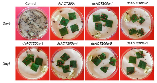 The following are available online at https://www.mdpi.com/2075-4450/11/7/449/s1, Figure S1: The relative location of potential sites were predicted to generate effective siRNAs after mutation introduction to ACT200a (ACT200a-1 to ACT200a-6), Table S1: List of oligonucleotides used in this study.
