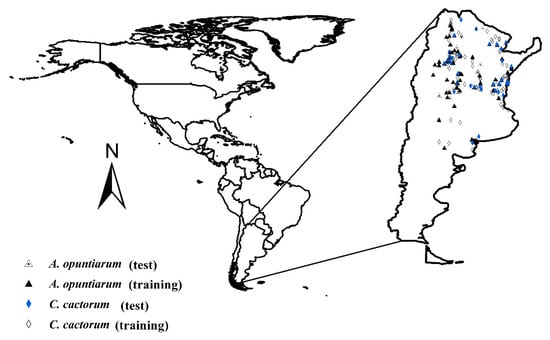 To eliminate a potential spatial correlation, species occurrence points within a distance of 5 km or less from one another were removed from the analysis. The final database used to construct the ecological niche models included 101 points for training and 34 for testing the occurrence of C. cactorum, and 60 for training and 20 for testing A. opuntiarum occurrence (Figure 1). Information of 19 bioclimatic variables from WorldClim ver 2.0 (Sustainable Intensification Innovation Lab, Manhattan, NY, USA) was extracted from each point selected and a Spearman correlation in the Past 2.17c software was conducted to eliminate correlated bioclimatic variables. To compare statistical yield and explore results with a variable set with different correlation values, set 1 eliminated those variables with higher correlation values of 0.75 and −0.75 and set 2 used values of 0.9 and −0.9.