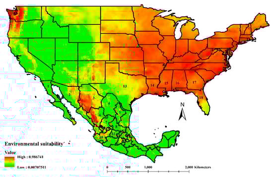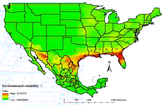 Environmental suitability for Apanteles opuntiarum, a parasitoid of Cactoblastis cactorum in North America according to the division by states for Mexico and the United States. State identifications for Mexico includes (1) Baja California, (2) Sonora, (3) Chihuahua, (4) Coahuila, (5) Nuevo Leon, (6) Durango, (7) Zacatecas, (8) San Luis Potosi, (9) Aguascalientes, (10) Jalisco, (11) Guanajuato, and (12) Queretaro. State identifications for the United States includes (13) Texas, (14) Louisiana, (15) Mississippi, (16) Alabama, (17) Georgia, and (18) Florida. As the environmental suitability level moved towards the red end of the scale, a more significant environmental suitability for A. opuntiarum was calculated.