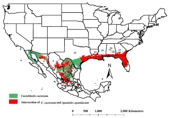 A successful biological control program is characterized by natural enemy survival and dispersion from the introduction site. For A. opuntiarum, their environmental suitability matched efficiently in the currently invaded areas of C. cactorum in the United States and even expanded to reach the central coastal areas of Texas where C. cactorum recently invaded. Our niche modeling presents an excellent opportunity to properly choose A. opuntiarum liberation sites in the United States with suitable ecological factors to ensure the parasitoids’ survival and dispersal. The same site selection criteria could be expected in an A. opuntiarum liberation effort in Mexico. In both countries, sites with suitable environmental conditions for A. opuntiarum survival were identified, increasing the likelihood for the parasitoid to be in contact with cactus moth larvae, increasing the chances for their survival and persistence [32].