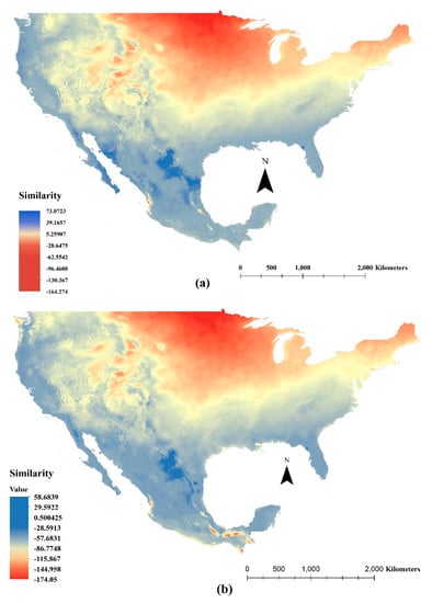 Mess analysis in North America for (a) Cactoblastis cactorum, (b) Apanteles opuntiarum. Scale bar shows the analogous level between the calibration (Argentina) and the transference areas (North America). Dark blue color and positive values indicate sites with climatic conditions similar to those in the insect species’ native ecological niche; dark red color and negative values indicate degrees of dissimilarity and that at least one bioclimatic variable was outside the range of the insect species’ native niche [52].