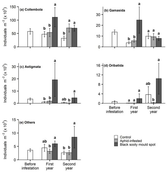 Of the 4.80 × 106 soil meso-fauna collected in samples, Collembola was the most dominant taxon, comprising 75.5% of the total. Significantly higher Collembola densities were observed in the black sooty mould spots in the first year, and in both the aphid-infested rows and black sooty mould spots in the second year, compared to the control treatments (Figure 2a).