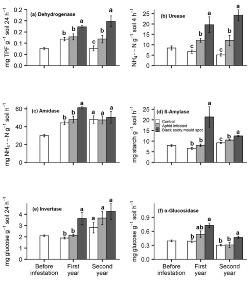 The activity of the soil enzymes: dehydrogenase (a), urease (b), amidase (c), β-amylase (d), invertase (e) and α-glucosidase (f) under the canopies of willow plants, prior to aphid inoculation (before infestation), and after aphid inoculation (control, aphid-infested, and black sooty mould spots) in the first and second year. The values are the means ± SE. Different letters indicate significant differences between the treatments at each sampling time (Tukey’s HSD test, α = 0.05).